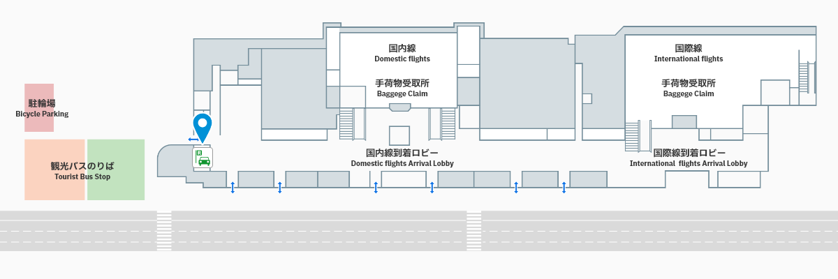 国内線到着ロビーを出て右手側に各レンタカー会社の受付カウンターを設置しております。