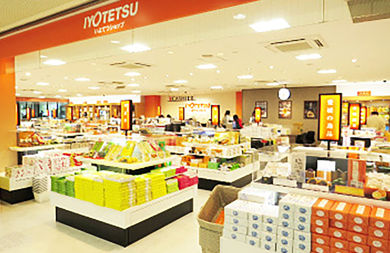 いよてつショップは、松山空港内でもひときわ広い売場面積を誇り、ゆったりとした空間でお買い物をお楽しみいただけます。愛媛の銘菓や特産品、空港限定商品など、「喜ばれるおみやげ」を豊富に取り揃え、皆様のご来店を心からお待ち申し上げております。商品の発送も承っておりますので、お気軽にお申し付けください。