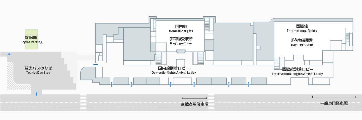 松山空港旅客ターミナル周辺の道路は、一部の降車レーンを除き駐停車禁止となっています。
