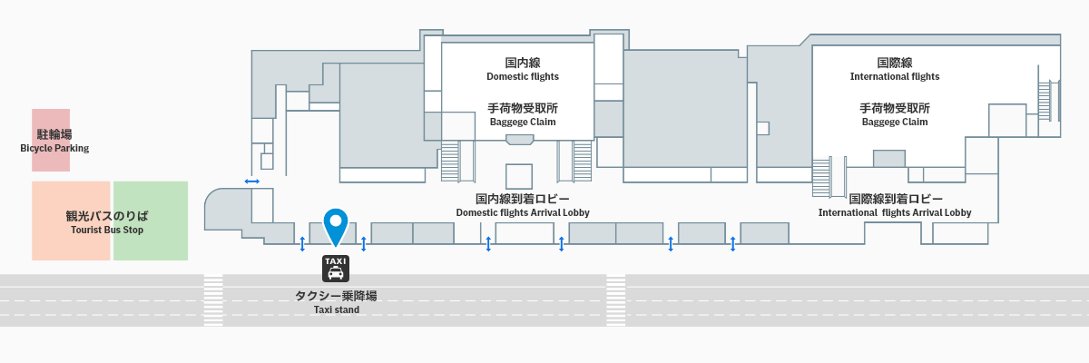 タクシー乗り場は、国内線到着ロビーの正面で入り口を出て右手側にあります。
